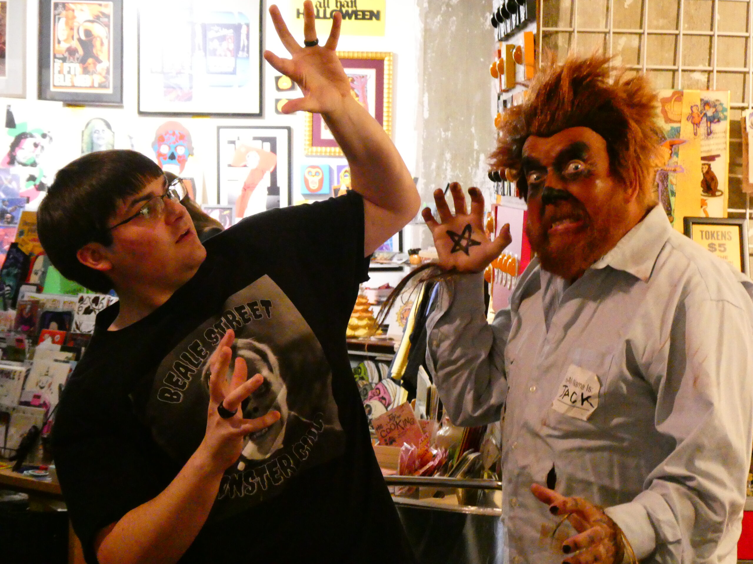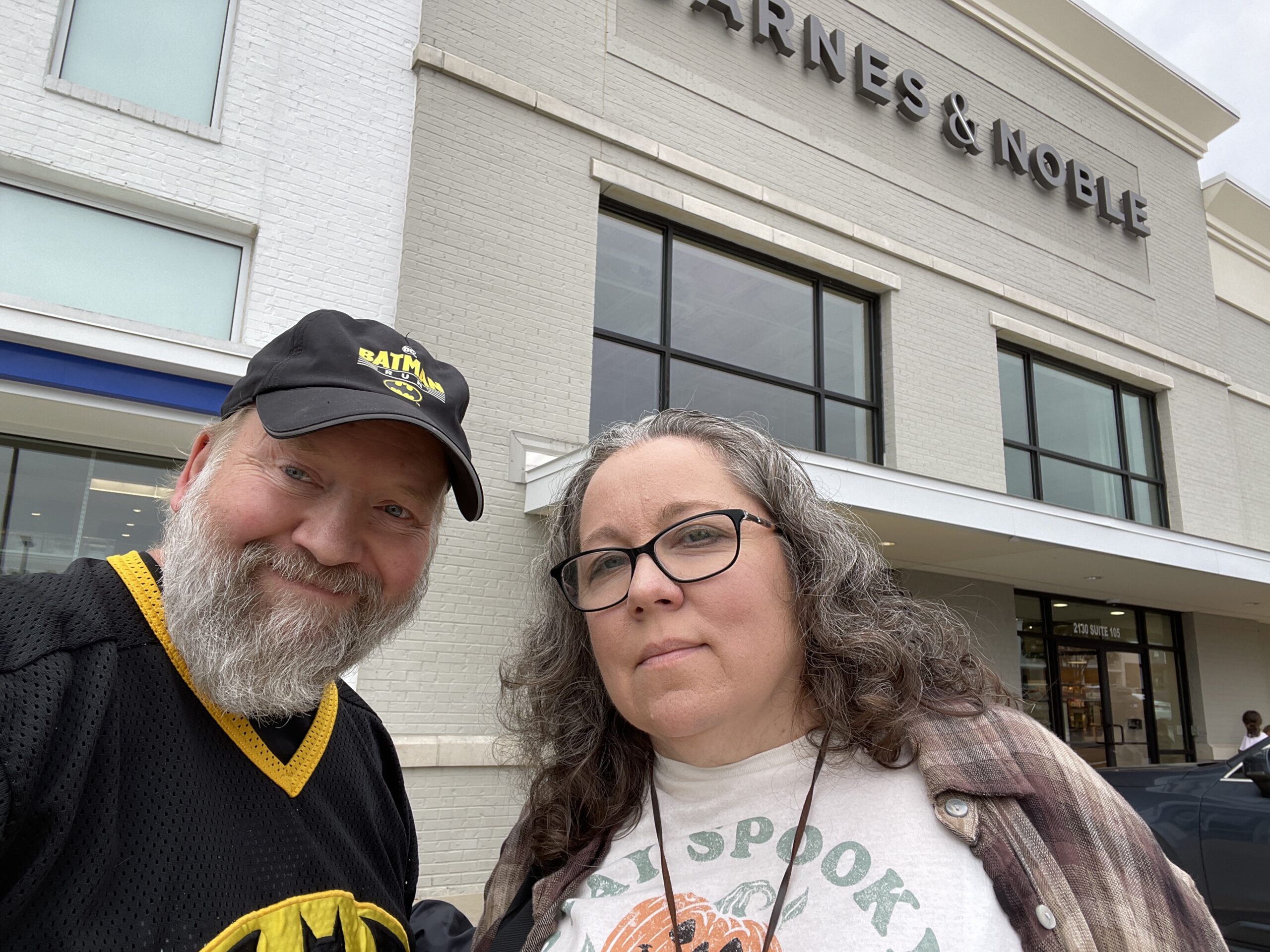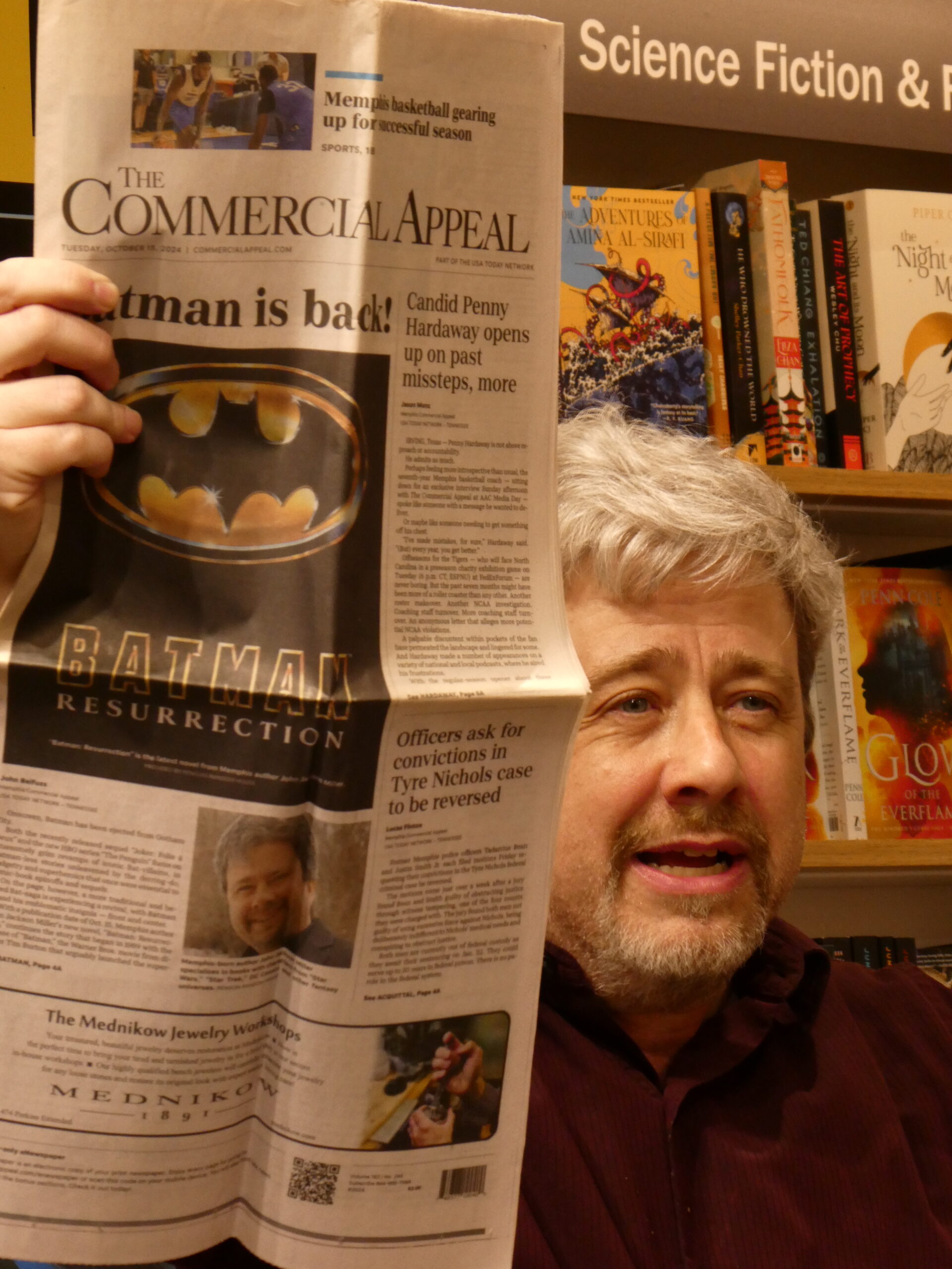 John’s childhood sounds very similar to my own, and not just the growing up in and around Memphis parts. We were both named after our fathers who came from large families, and both of our moms were an only child- and knew Elvis back in the day. My wife Nicki and I have known JJM since before she and I were actually officially a couple, and often see him at local book signings, library appearances, and conventions around the mid-south. He was a fixture at MidSouthCon for many years, and is currently on a signing tour where he’s been hanging out with some super-folks like “Batman” movie executive producer Michael Uslan at the New York Comic Con, and in a convention green room with “The Flash” star John Wesley Shipp. At this JJM B&N book signing, Nicki and I ran into some friends of ours from MidSouthCon– and the Bluff City Batman!
